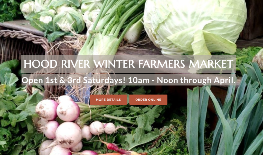 The Hood River Farmers Market is currently open for the winter season (December – April) on the first and third Saturday of every month from 10 a.m. – 12 p.m located at Ferment Brewing Company, 403 Portway Avenue. For more information, please visit Gorge Grown Food Network.